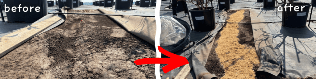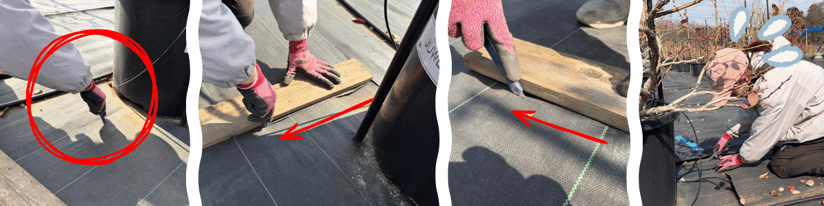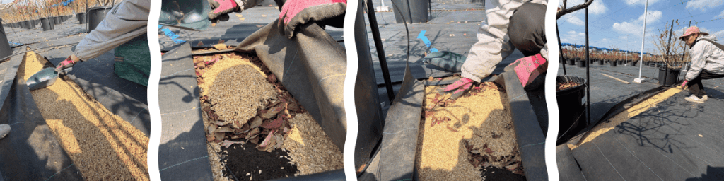「シートを剥がして地面を直す」のではなく、「シートを切って、籾殻で溝を埋める」。