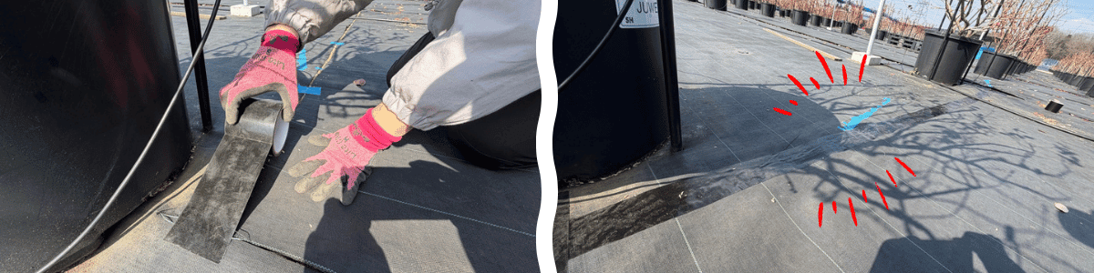 最後のステップは、カットした防草シートをぴったり合わせ、シワにならないように補修テープで貼り合わせます。幅が広いテープだと失敗は少ないです。