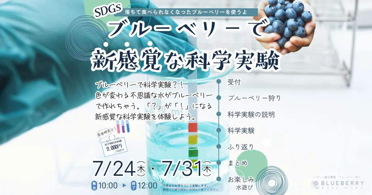 ブルーベリーで科学実験?!この夏休みに、新感覚な科学実験を企画しました。色が変わる不思議な水がブルーベリーで作れちゃいます。「?」が「!」になる新感覚を、ぜひ体験してみてください!事前予約制です。7月12日午前8時から予約開始!