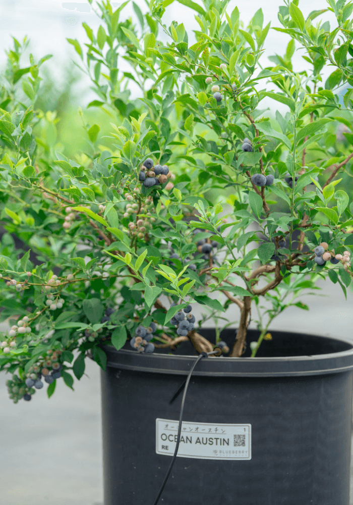- 土ではなくブルーベリー栽培に特化したスポンジ状の専用培地「アクアフォーム(生花などに使われるオアシスのような吸水性の高い素材)」で栽培